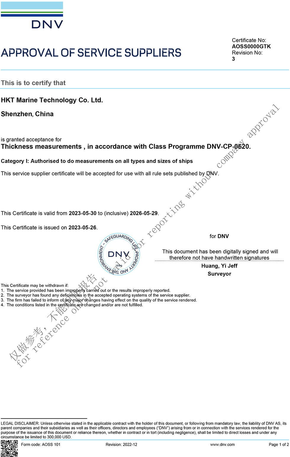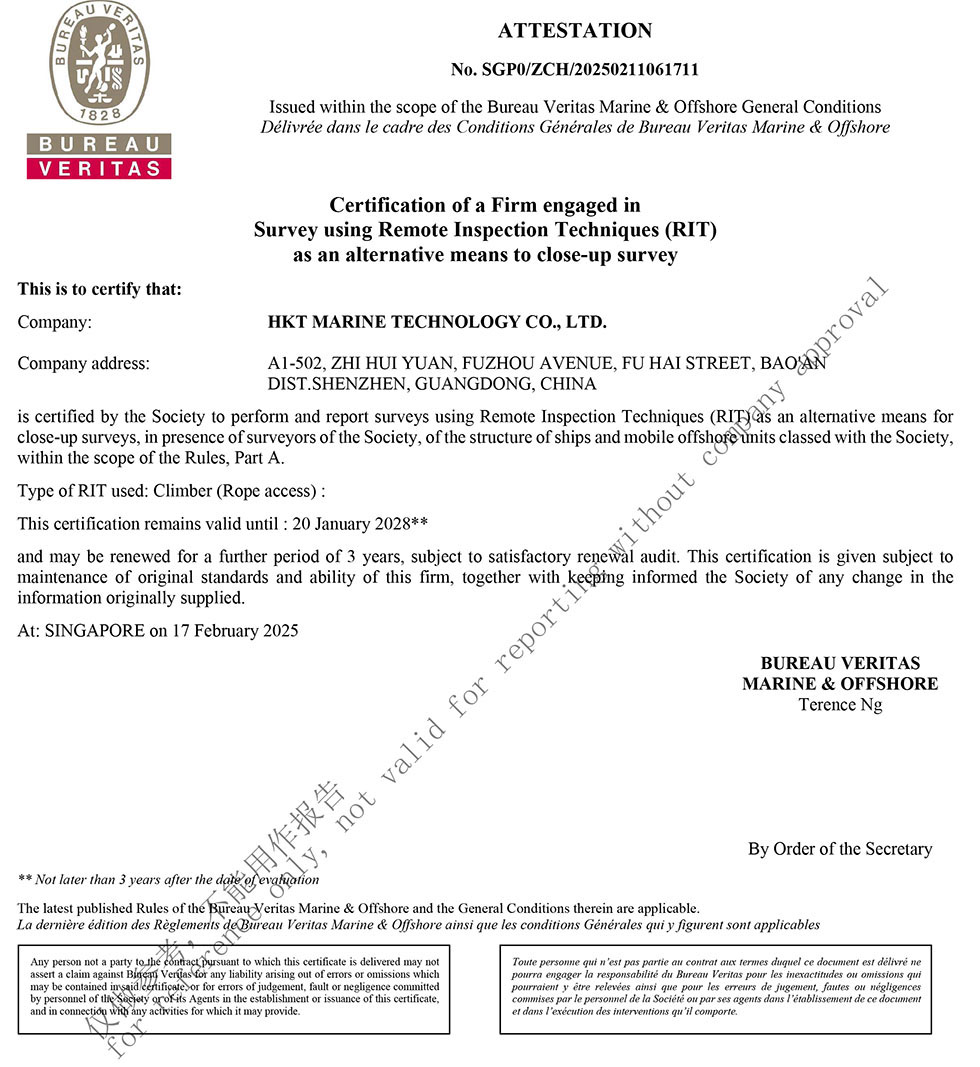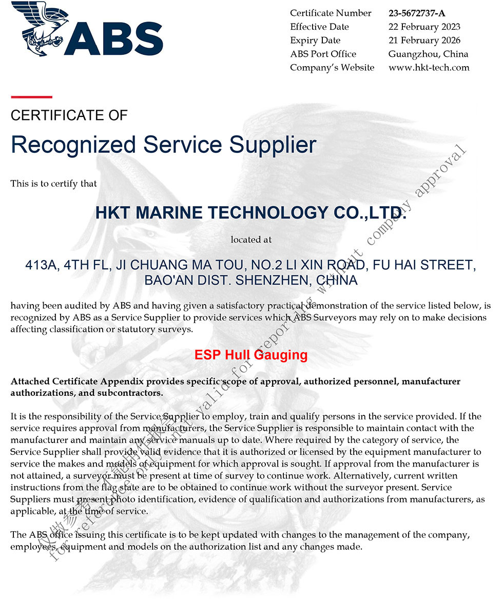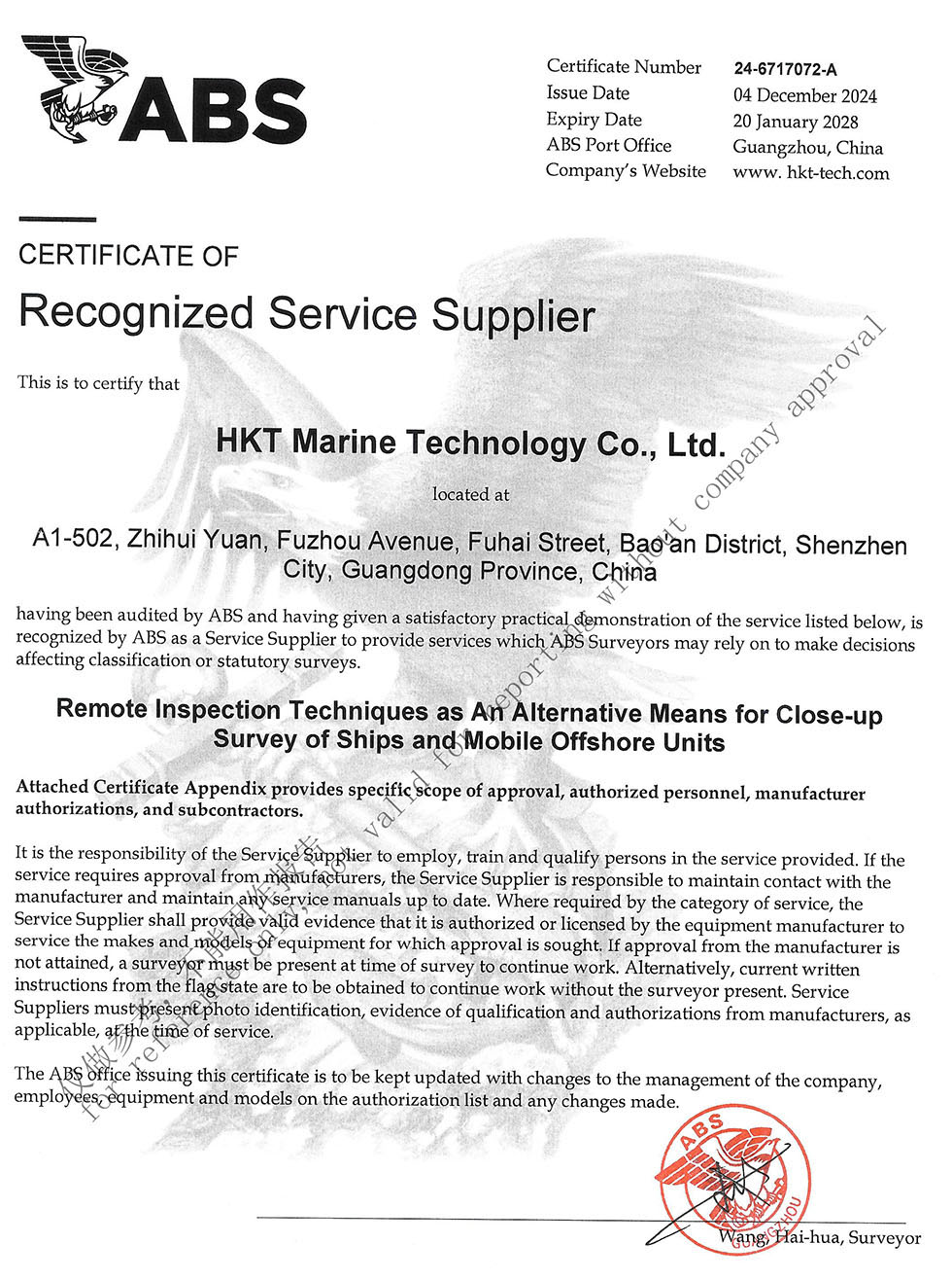 HKT Marine Technology Co., Ltd established in 2009 in Shenzhen China , with branch office at Zhoushan, dedicate to enhancing vessel safety, efficiency, and operational reliability, now we have developed as one of the best marine service companies in China.Hull Department(Steel Construction), For UTM service, we are approved by ABS, DNV, LR, BV, NK, KR, RINA and IRS,CCS, RMRS, our RIT (Remote Inspection Technique) performed by rope access in COT on tankers ships.Besides assisting UTM and close up survey, rope access team is also applied in painting jobs by climbing, instead of staging. Automation DepartmentMost of our electric and electronic engineers were worked as ETO onboard, and some of them had been working as maker service engineers for a long time, Who are professional in various of control system. Especially for those obsolete system, we can provide alternative solutions.Mechanical DepartmentOur mechanical teams specialize in ME /AE overhaul, hydraulic crane and steering gear, deck machineries overhaul and service, Aircon and provision plant compressor repair and overhaul, heat exchanger cleaning, etc.Spare Part DepartmentWith an abundant source worldwide supply chain, no matter genuine, OEM, or alternative parts, we can quickly respond and support for the spares of main engine, auxiliary engine, boiler, air compressor, air handling unit, deck machinery, steering gear, oil purifier, pumps, valves, and so on.